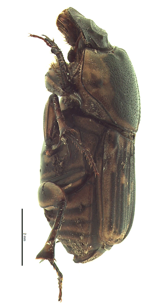 Total body length 7.0–11.0 cm (0.27–0.43 in). Body oblong oval, somewhat dorsoventrally compressed; may be caked in dung. Color dark brown; pronotumpronotum: