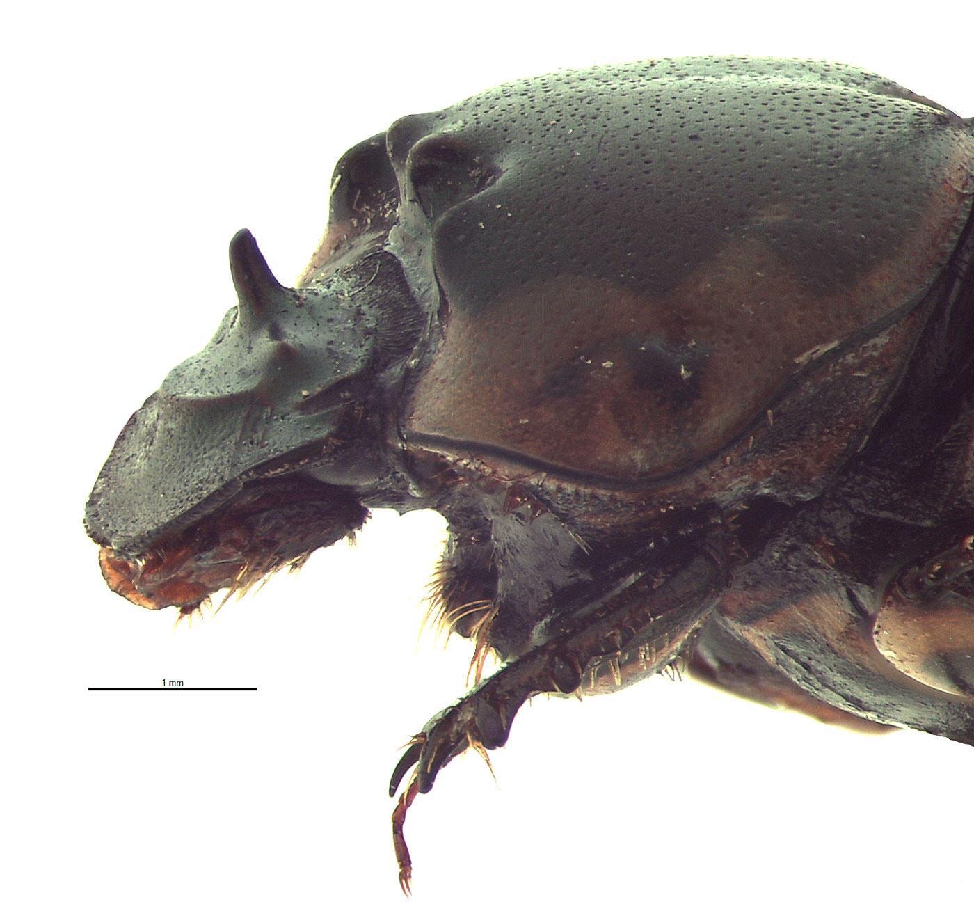 ridge versus O. cinctus that lacks horns or distinct ridges in both sexes), color of the pronotumpronotum: