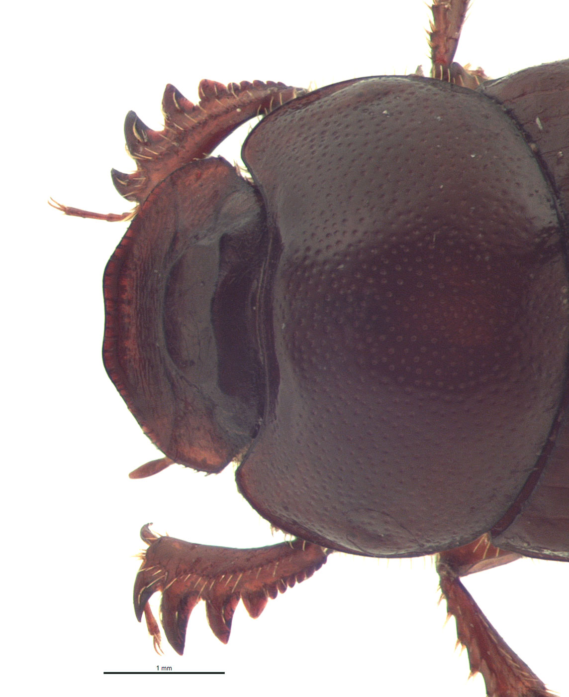 Total body length 6.0–10.0 mm (0.24–0.39 in). Body shape oval; may be caked in dung. Color shiny black. Small or medium-sized Onthophagus, over 6 mm. Clypealclypeal: