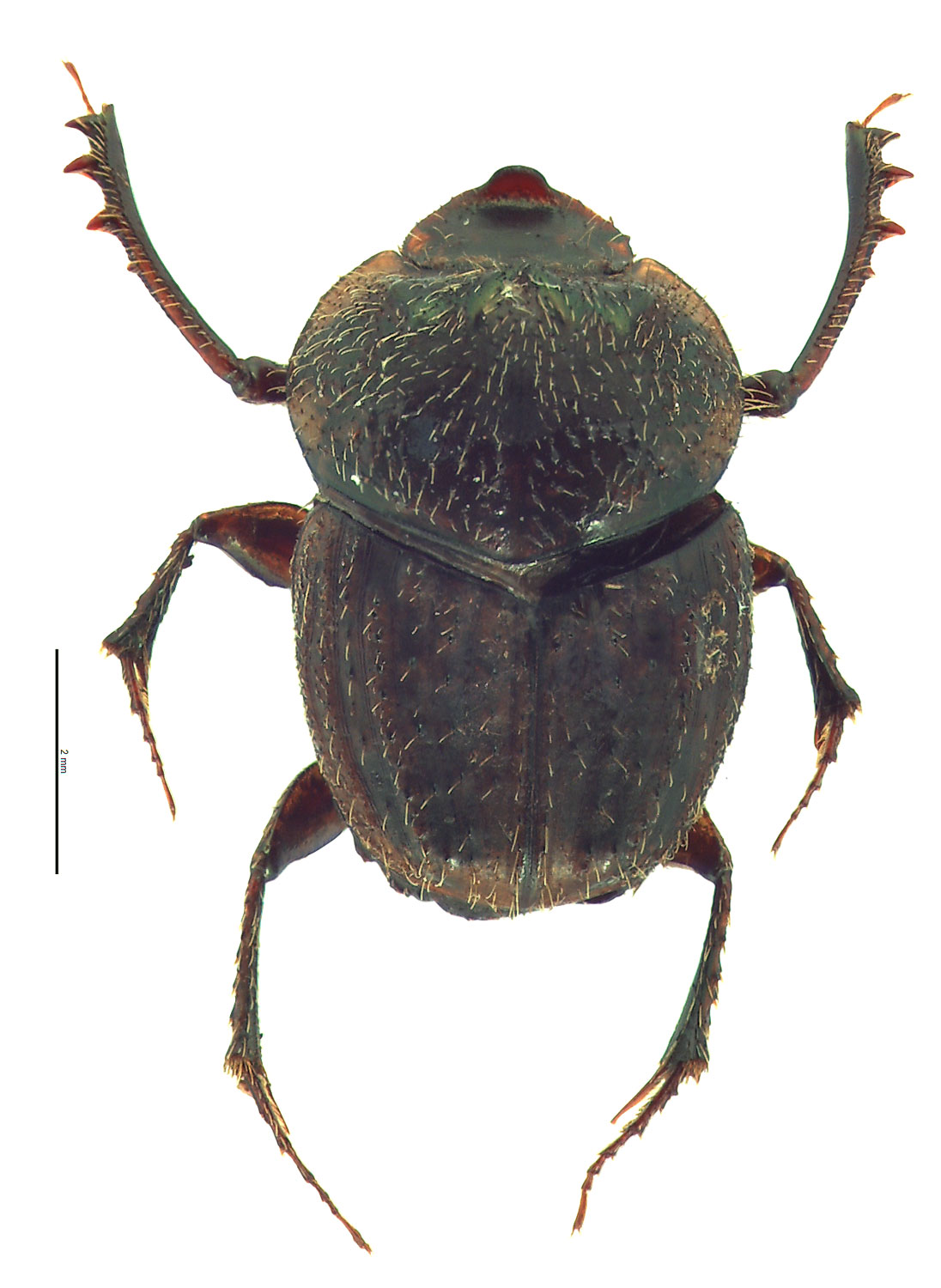Total body length 6.0–8.0 mm (0.23–0.31 in). Body shape oval; may be caked in dung. Color dull brownish. Small-sized Onthophagus, 6-10 mm. Clypealclypeal: