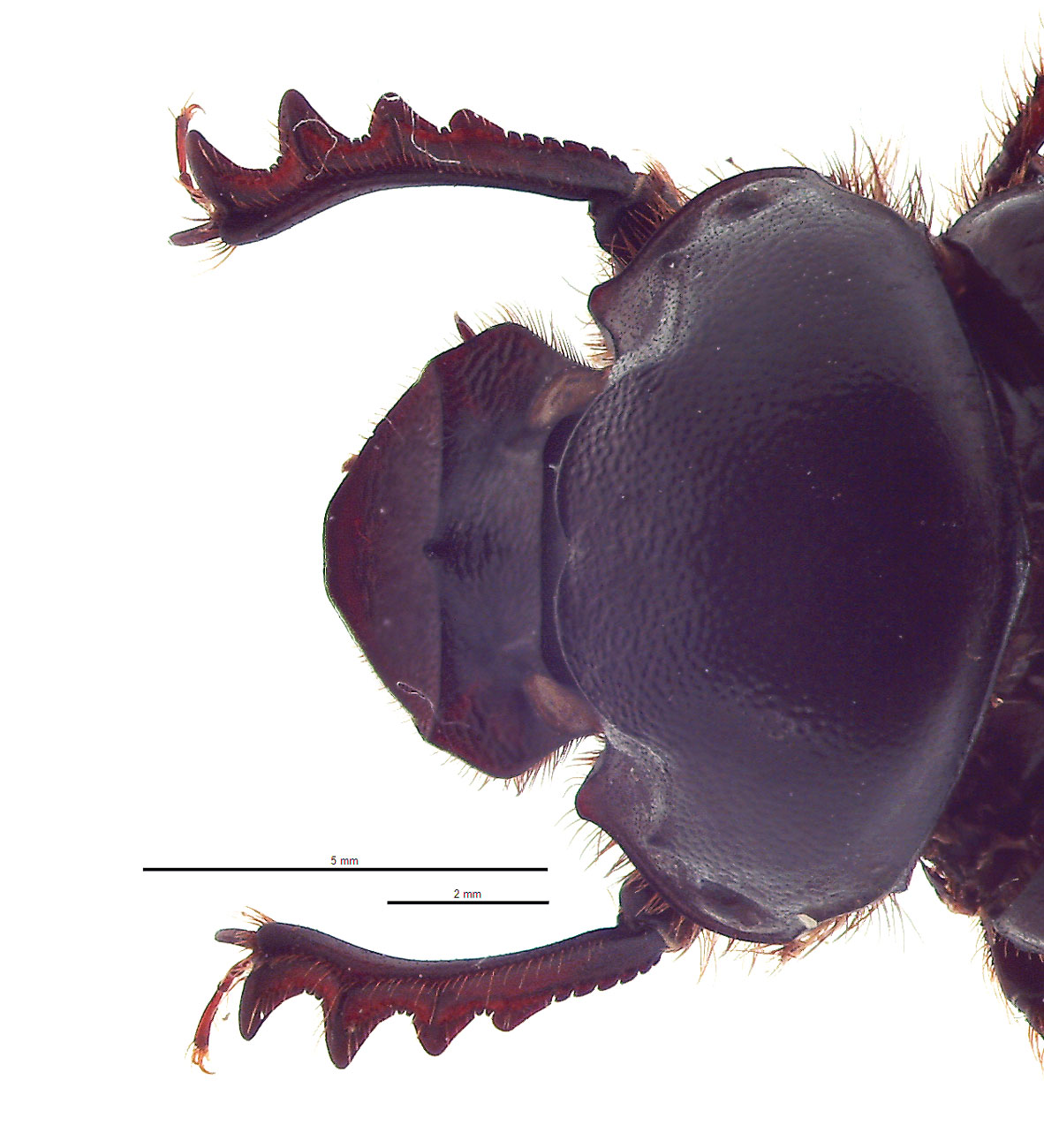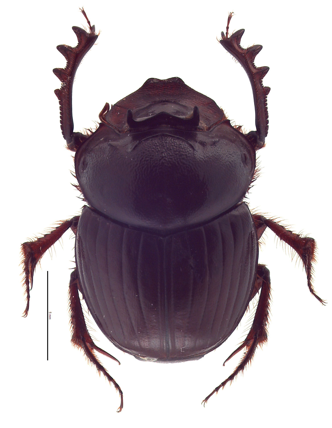 Total body length 11.0–22.0 mm (0.43–0.86 in). Body shape oval; may be caked in dung. Color shiny black. Small to medium-sized Onthophagus, over 6 mm. Clypealclypeal: