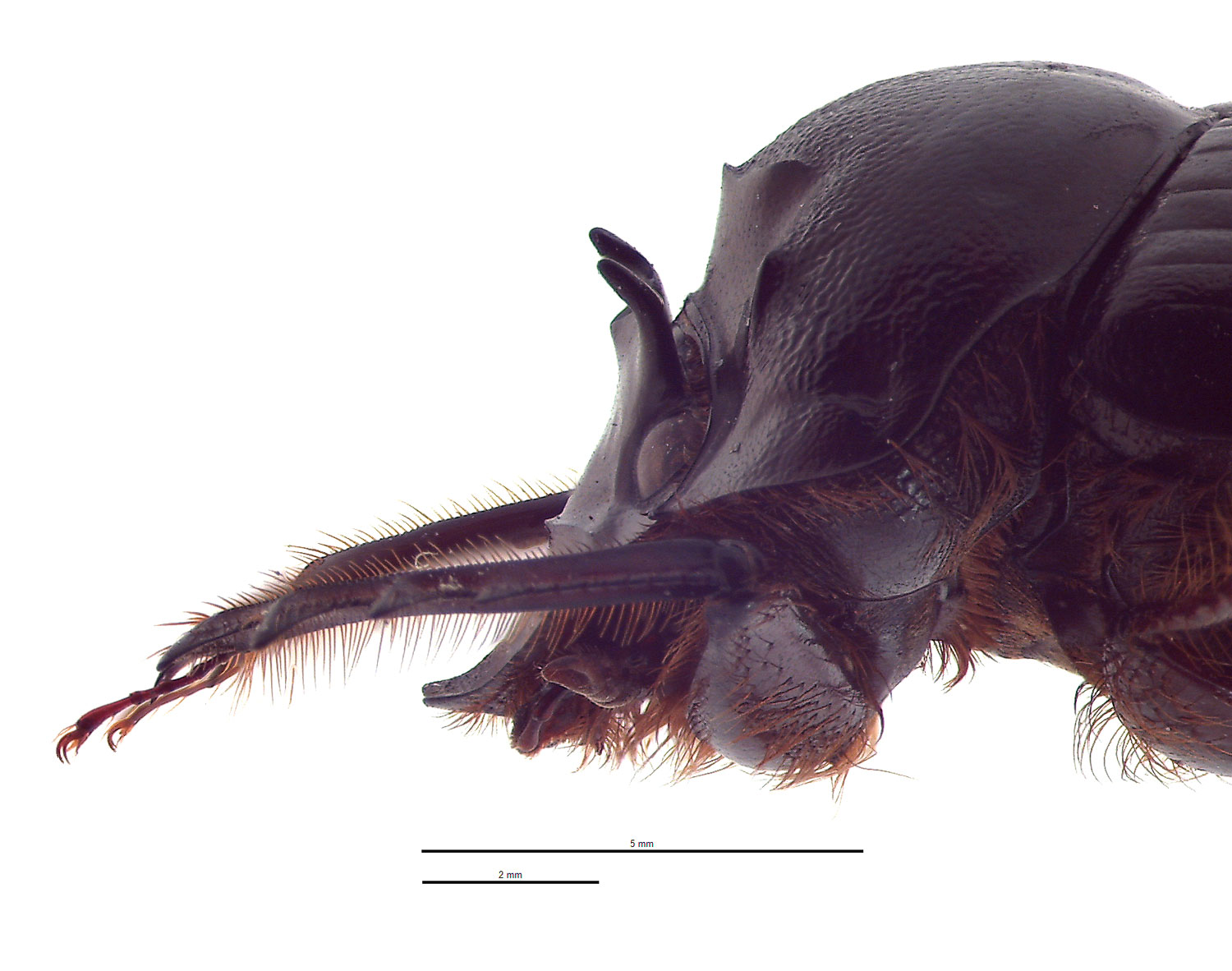 Major males of these species can be separated by examining the head armature (O. laminatus has two upward curving, non-bifurcate horns connected by a distinct ridge versus O. binodis and O. cuniculusthat lack horns or tubercles, O. incensusand O. comperei that lack a ridge between the horns, O. armatus that has a distinctly bisinuatebisinuate: