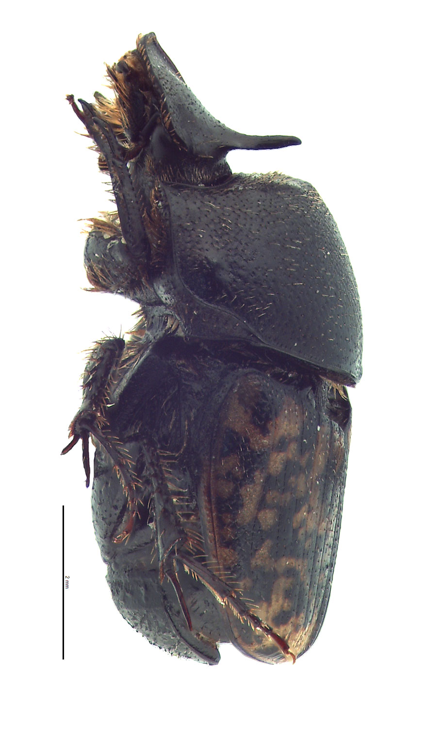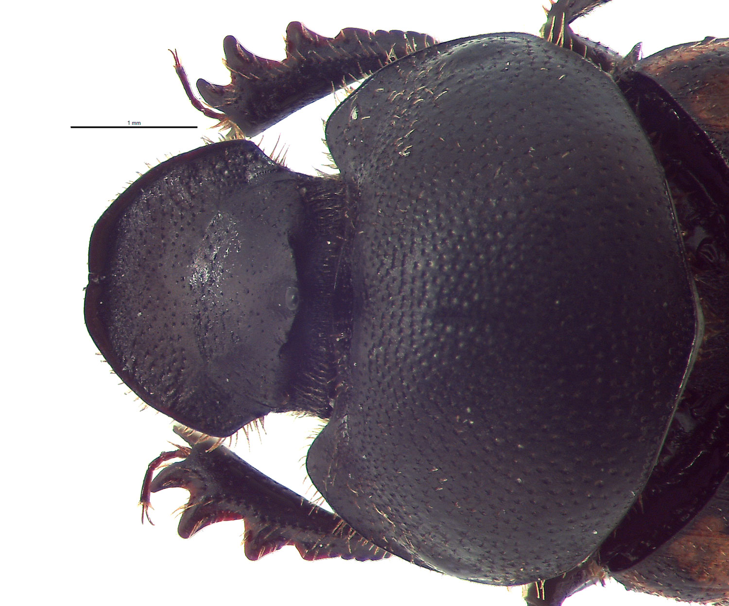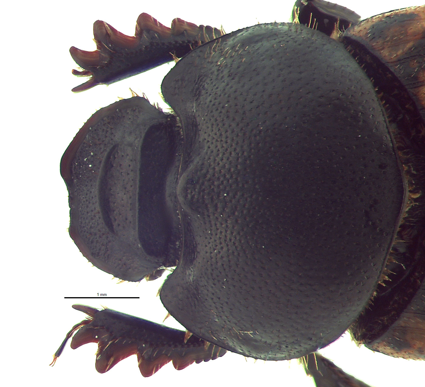 brown, mottled with black. Small-sized dung beetle, 6-10 mm. Clypealclypeal: