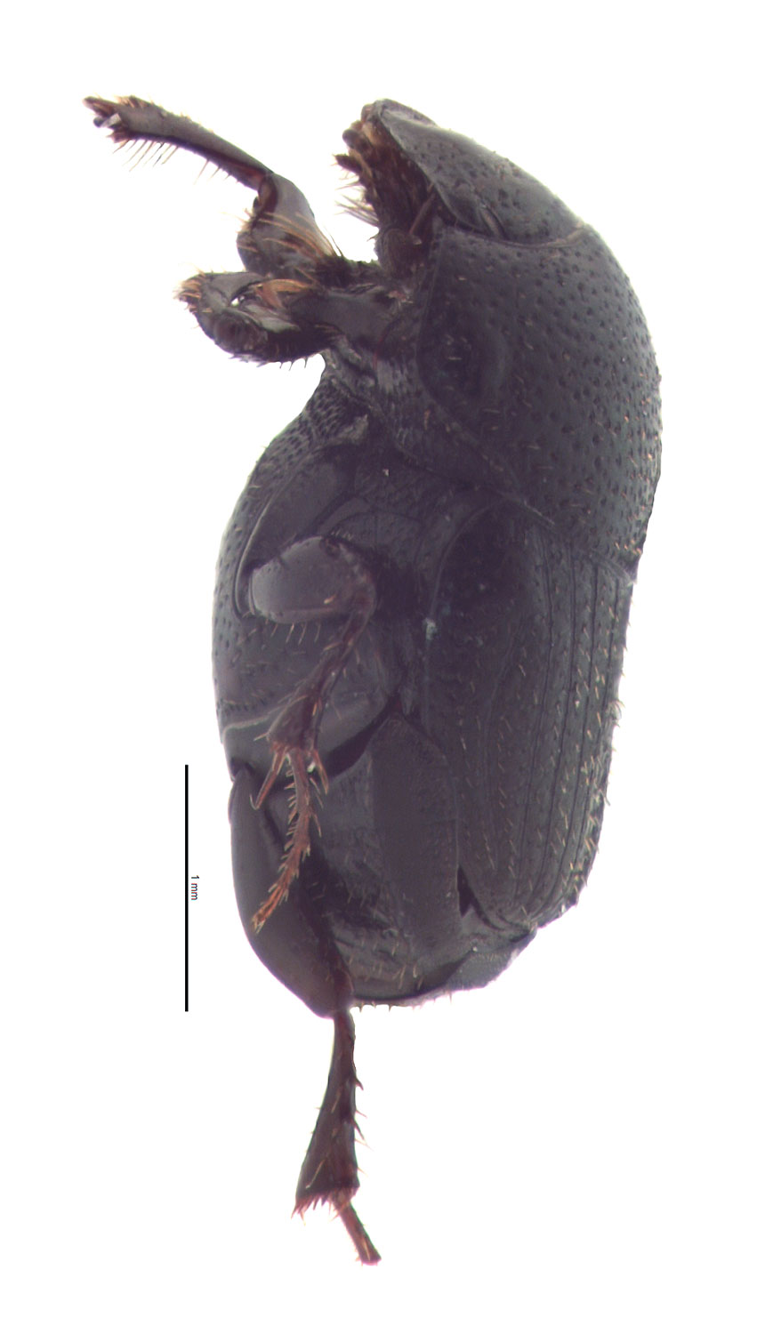 Total body length 2.0–4.1 mm (0.07–0.16 in). Body shape oval; may be caked in dung. Color shiny black. Size tiny, under 6 mm. Clypealclypeal: