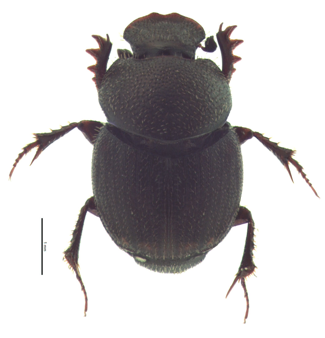 Total body length 3.5–5.0 mm (0.13–0.20 in). Body shape oval; may be caked in dung. Color dull black, sometimes with orange spots on abdomen. Size tiny, under 6 mm. Sexes noticeably dimorphicdimorphic: