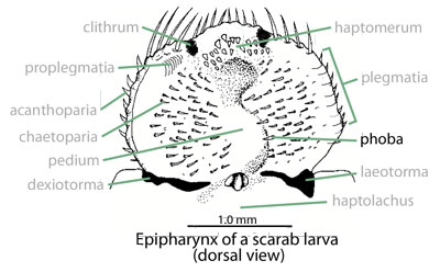 Brach V. 1977. Larvae of Onthophagus polyphemi polyphemi and Onthophagus tuberculifrons Coleoptera Scarabaeidae. Bulletin Southern California Academy of Sciences 76: 66-68.): Grub C-shaped, hump-backed, cylindrical, and cream-colored. Maxillamaxilla: