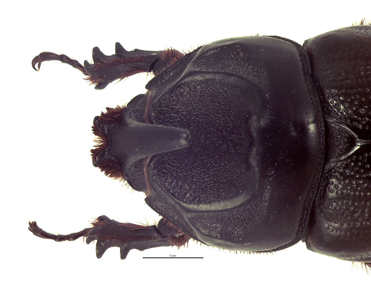not produced. Head of male with long, slightly curved horn ending in single point; female with horn present but usually reduced. Pronotumpronotum: