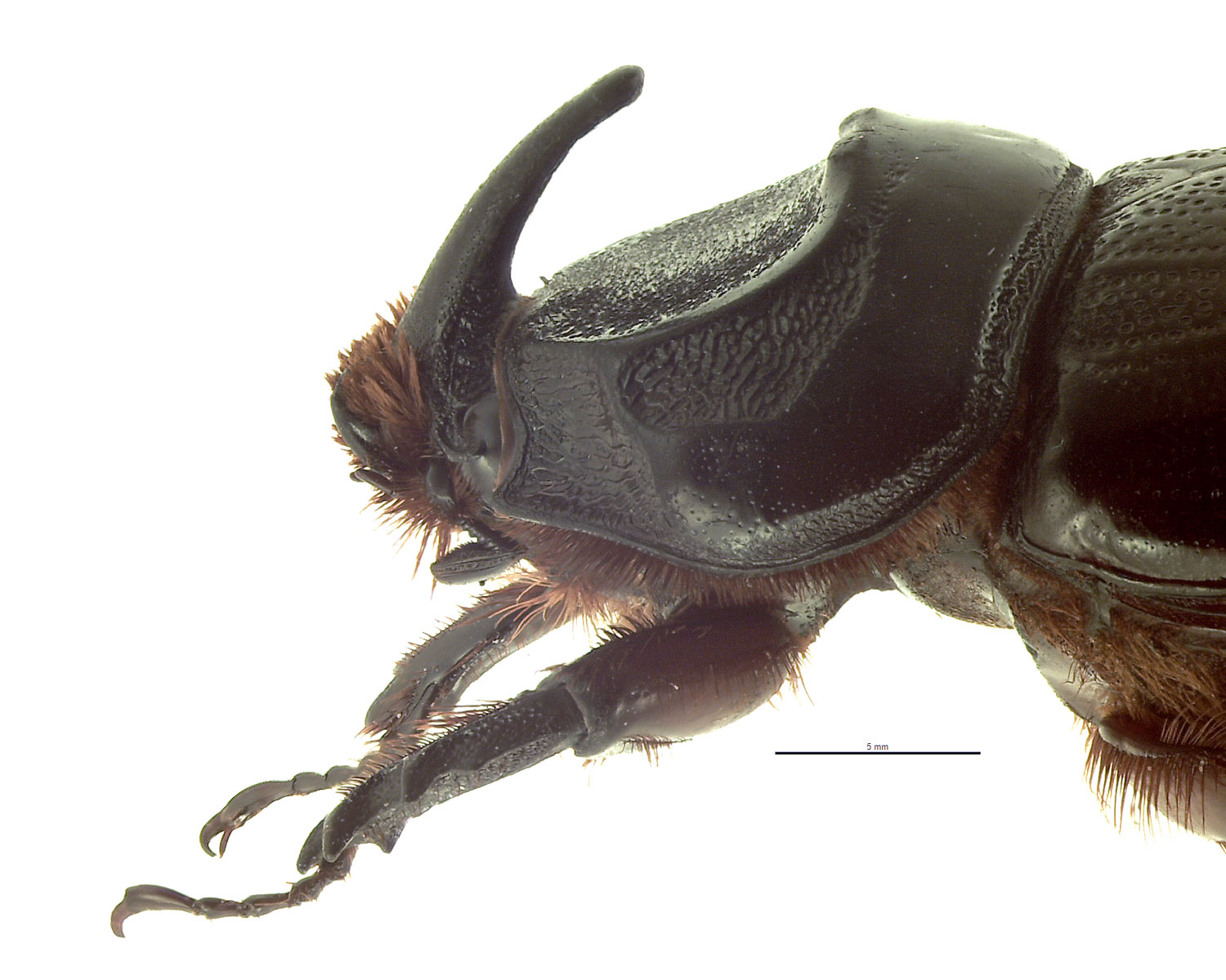 ) and the form of the pronotal depression (O. rhinoceros with broad, sculpted depression versus Xylotrupes without an anterioranterior: