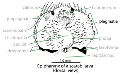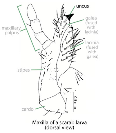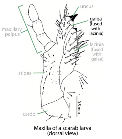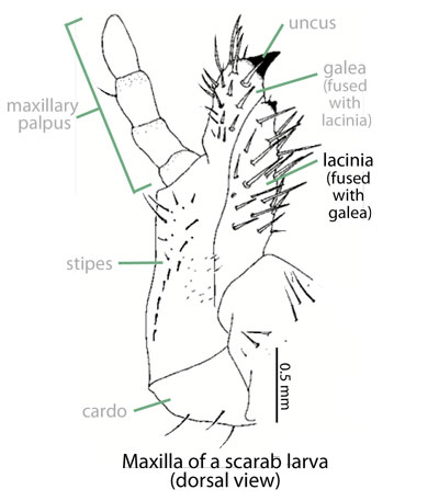 feel distinctly "squishy" and crawl on their backs with their legs up. Grub C-shaped, not hump-backed, cylindrical, and cream-colored. Maxillamaxilla: