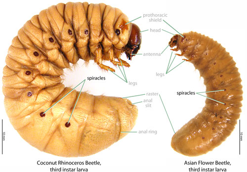 Bedford G. 2015. Oryctes rhinoceros (coconut rhinoceros beetle). Invasive Species Compendium. Wallingford, UK, CABI International. Available from http://www.cabi.org/isc/datasheet/37974 (accessed 2015).). It has been reported that larvaelarvae: