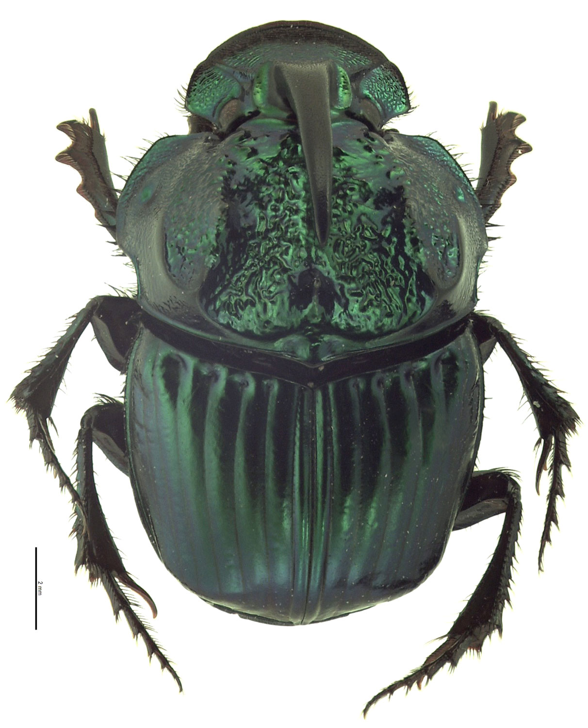 Total body length 13.0–19.0 mm (0.51–0.74 in). Color metallic green, rarely blue or yellow-green. Head of major male with single large horn; horn reduced in minor males, lacking in female. Clypeusclypeus: