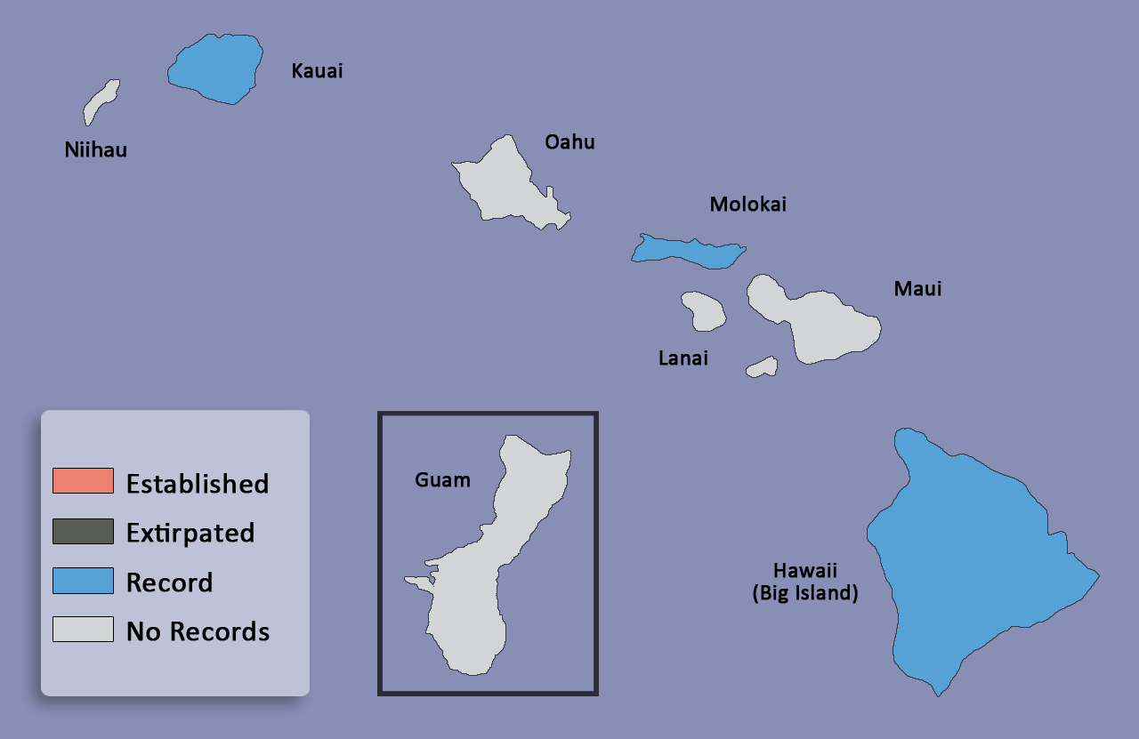 Weber P. 1954. Recent liberations of beneficial insects in Hawaii–IV. Proceedings of the Hawaiian Entomological Society 15: 635-638. full text (accessed 2015)). In 1955, further introduction attempts were made at Molokai Ranch on Molokai and Waimea on Kauai (Weber, 1955Weber, 1955: