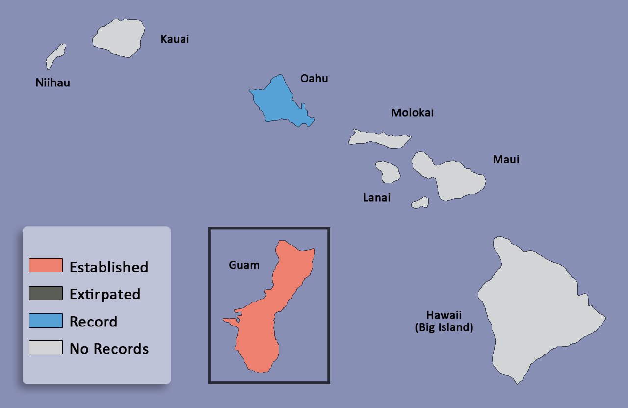 Established. This species is established on Guam, having first arrived in 1985 (Schreiner and Nafus, 1986Schreiner and Nafus, 1986: