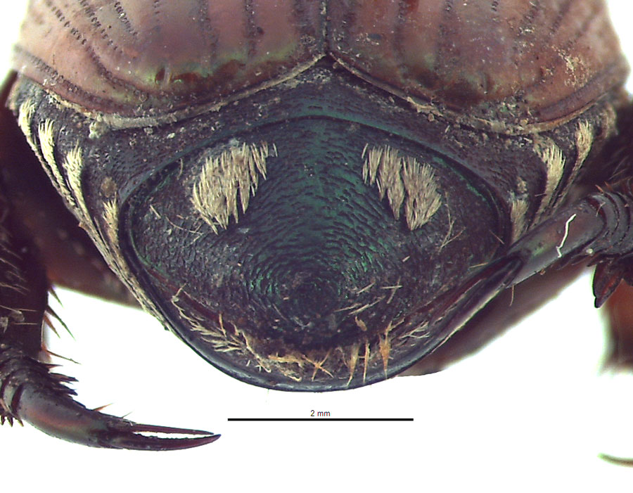 with 2 vaguely oval-shaped patches formed by dense whitish hairs (sometimes absent in worn specimens).