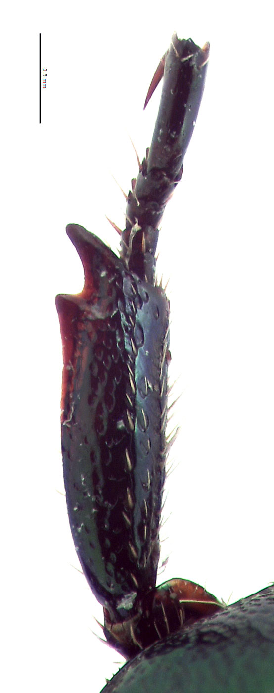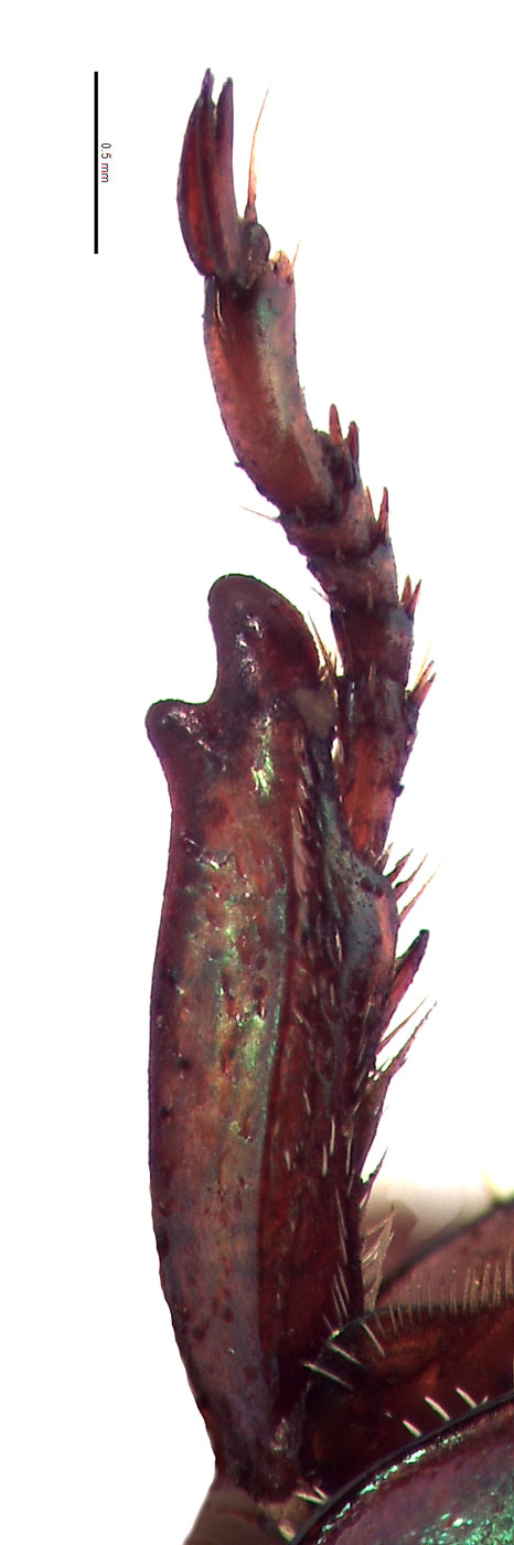 . Front claw toothed, male with toothed claw more robust than in female. Pronotumpronotum: