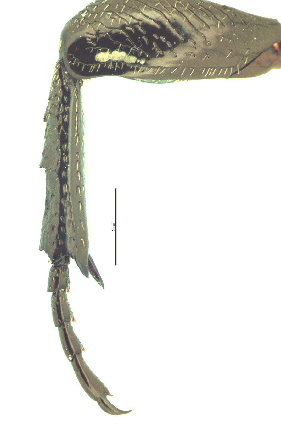 Total body length 19.9–26.8 mm (0.78–1.1 in). Body broadly oval; dorsoventrally flattened. Color shiny black, rarely shiny greenish; elytraelytra: